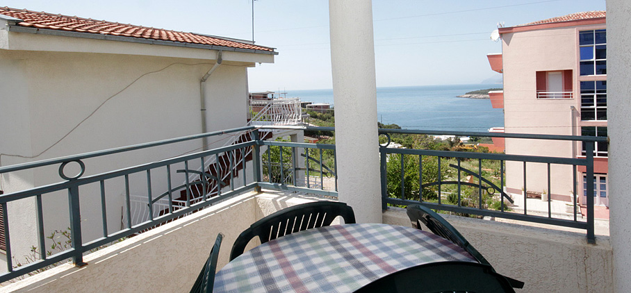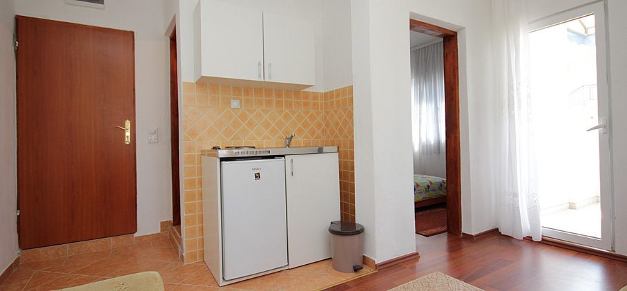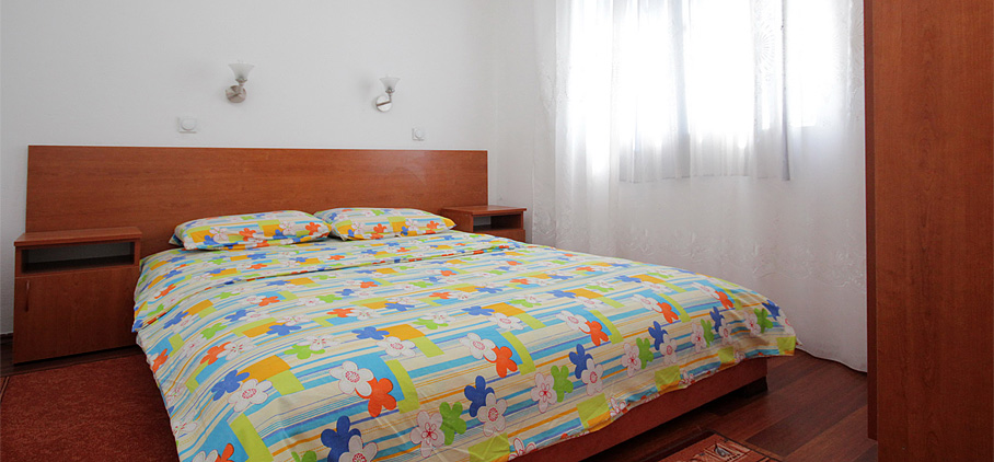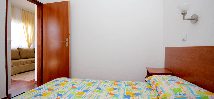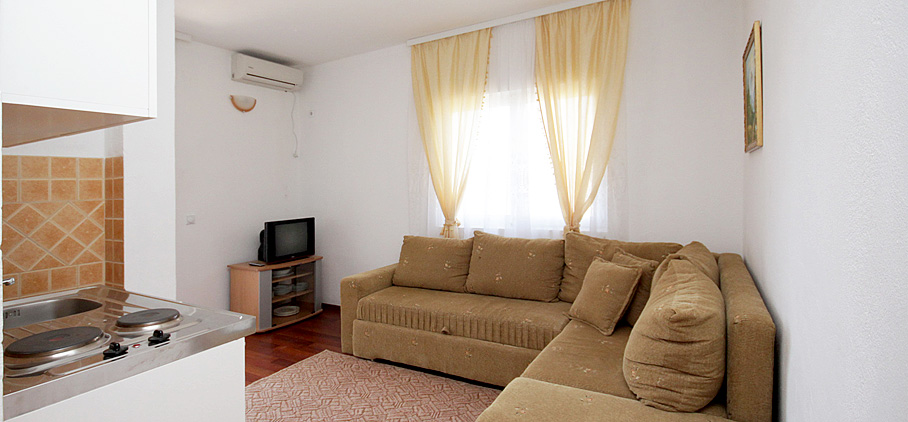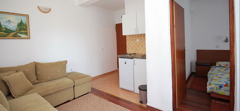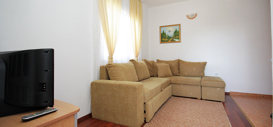 Smješten je na prvom spratu objekta i imamo dva ovakva apartmana u ponudi. Posjeduju jednu spavaću sobu sa francuskim ležajem i ormarom za garderobu. U dnevnoj sobi nalazi se ugao na razvlačenje koji može da posluži kao dodatna dva ležaja. Opremljen je mini kuhinjom, kupatilom, klima uređajem, televizorom i ima terasu.