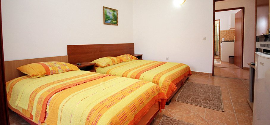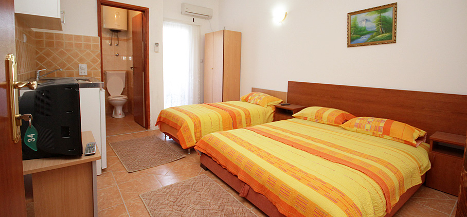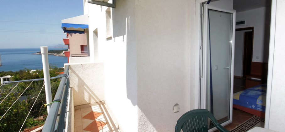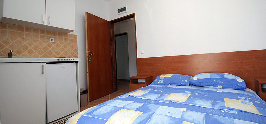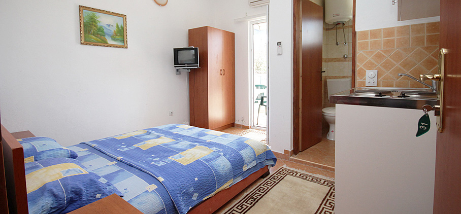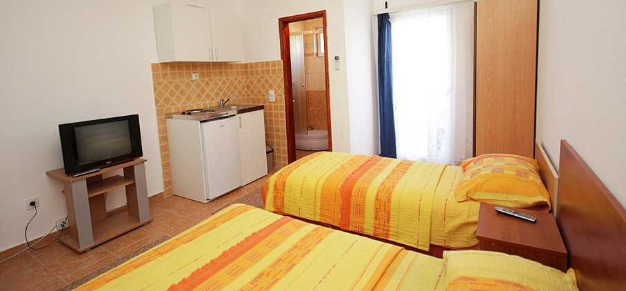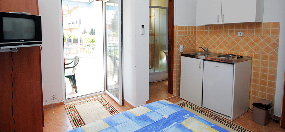 We offer 3 apartments of this kind, of which one with a double bed, one double and one triple. They are equipped with a kitchenette, bathroom, air conditioning, TV and balcony. All three studios are located on the first floor of our building.